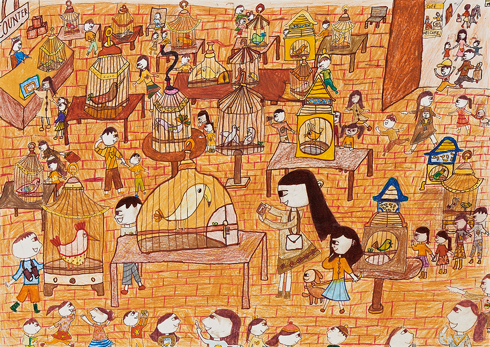 從右上衝入畫面的人群,加上在底部和到處都有人群訴說鳥店的 受歡迎。主角正在享受可愛鳥兒的觀賞樂趣。