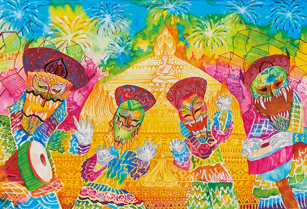 本作品表現的是泰國鬼面節慶典的熱鬧氛圍。四個面具表情設計各有特色。背景襯以細緻表現的寺院和傳統建築群。