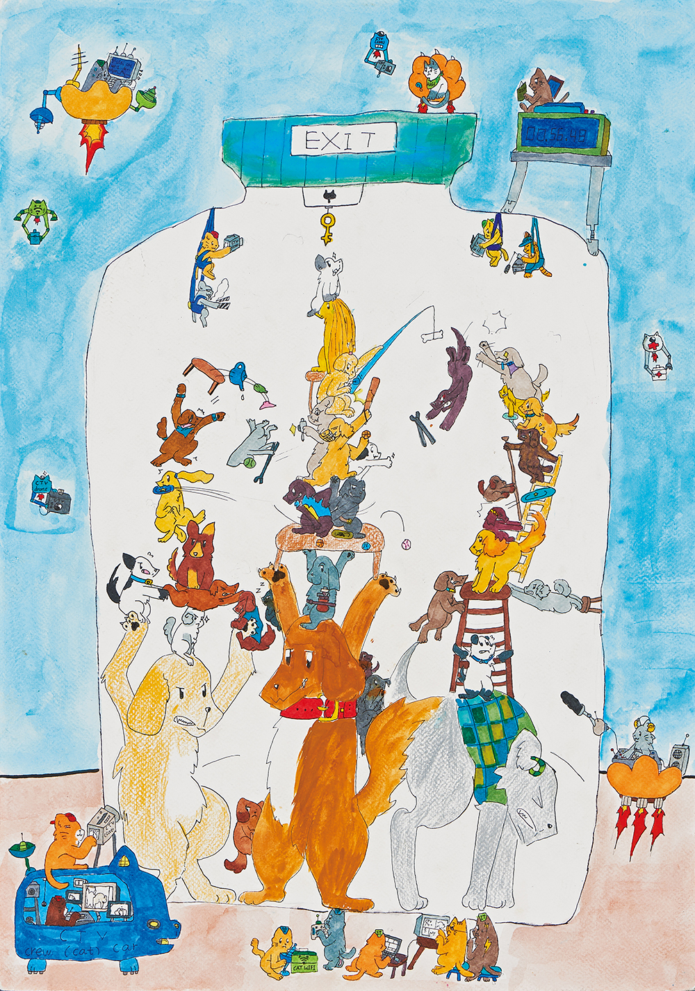 狗狗爭奪的畫面聚焦在一個大瓶子透明的呈現,動作大小變化多,非常細膩生動。注意看,瓶外還有貓咪在報導著競賽情形呢!