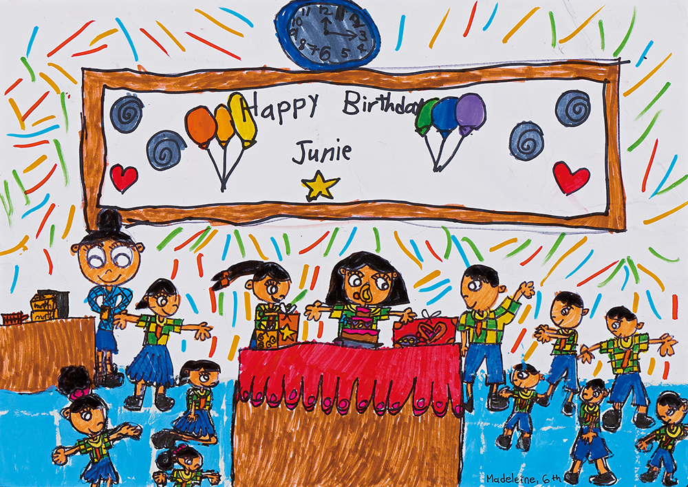 畫面中穿著相同服裝的人物是作者的同學,10分兩邊祝福「生日快樂」。看看正上方的時鐘,是午餐時間呢!作者細膩描繪記錄了愉快的瞬間。