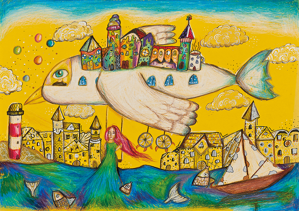 本作品以飛行為主題,畫面呈現海景、地景和天空。要裝的飛行器上搭載著色彩繽紛的房舍和一杯熱騰騰的飲料。