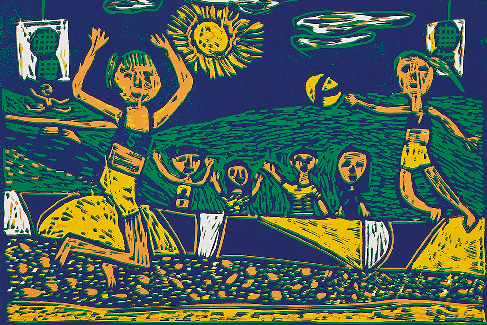 以版畫形式呈現排球運動的場景,人物的動態和肢體動作有充分的表現,版印的色調和諧,有獨特的視覺效果和趣味性。