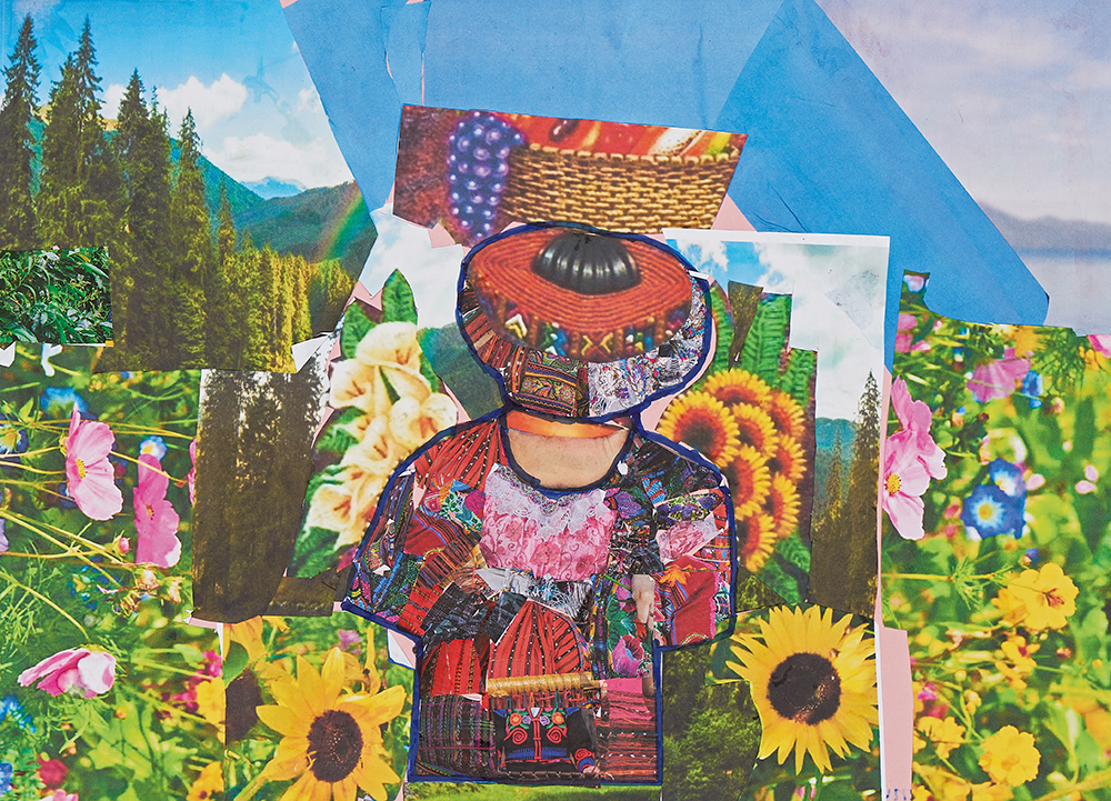 貼畫創意十足作品,中央貼上人物造形,全幅充滿滿園芬芳意境,是一幅好構想作品。