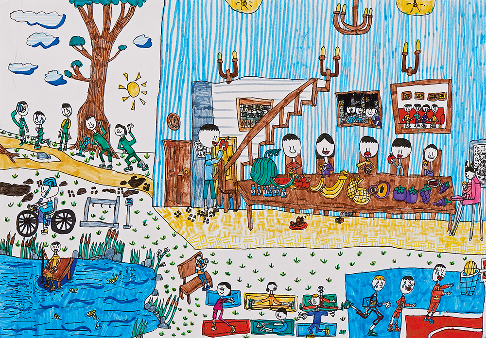分割的構圖,冷暖色調搭配得宜,流暢的線條,充分表現健康快樂生活的童趣。