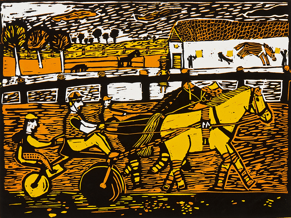 運用單版複刻的技法來表現田園風光,人物與馬匹的動態都掌握的相當好,尤其是留白的地方襯托出有顏色的部分,可見技法的優異。