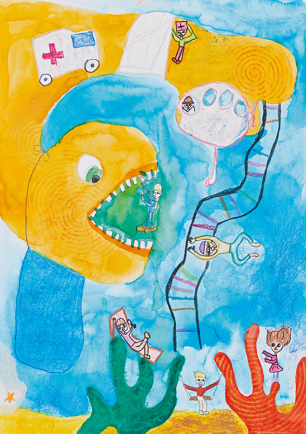 畫面中的0孩快樂的溜著滑板車,輕快的筆觸在主題與背景中飛揚,讓人感受到溜滑板的速度快感與歡樂。