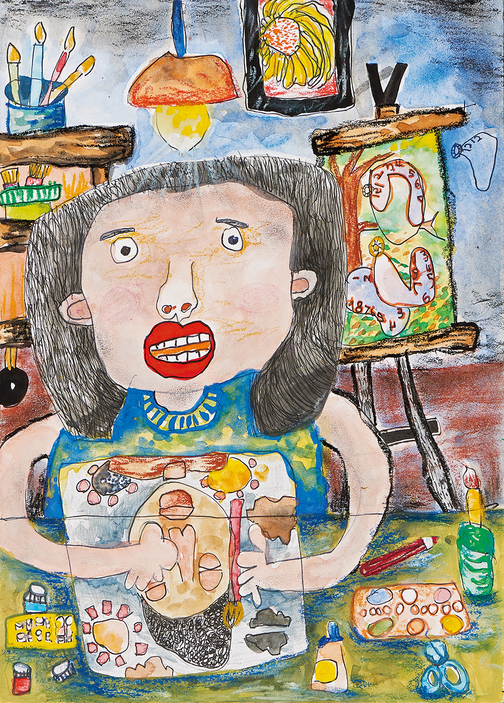 細筆勾勒填彩,造形稚拙,主題大而明顯,富有童趣。色彩可大膽塗抹。
