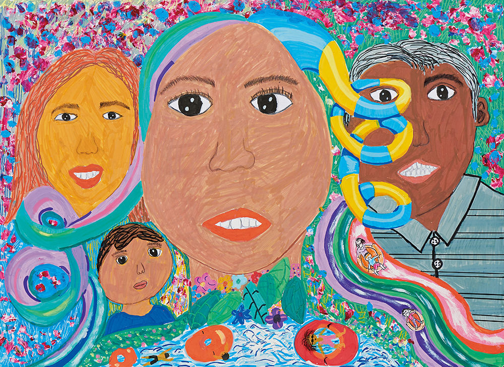 作者以每個人每天都在水上樂園為主題,表現自己心中的渴望。畫面有四個人物應該是一家人,媽媽是家中的核心人物。
