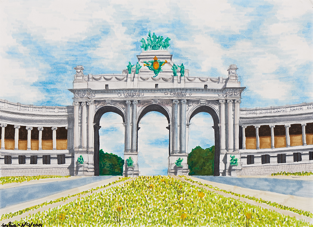 運用了透視呈現建築物青草綠地,採細膩灰色勾勒出歷史建築的雕刻。