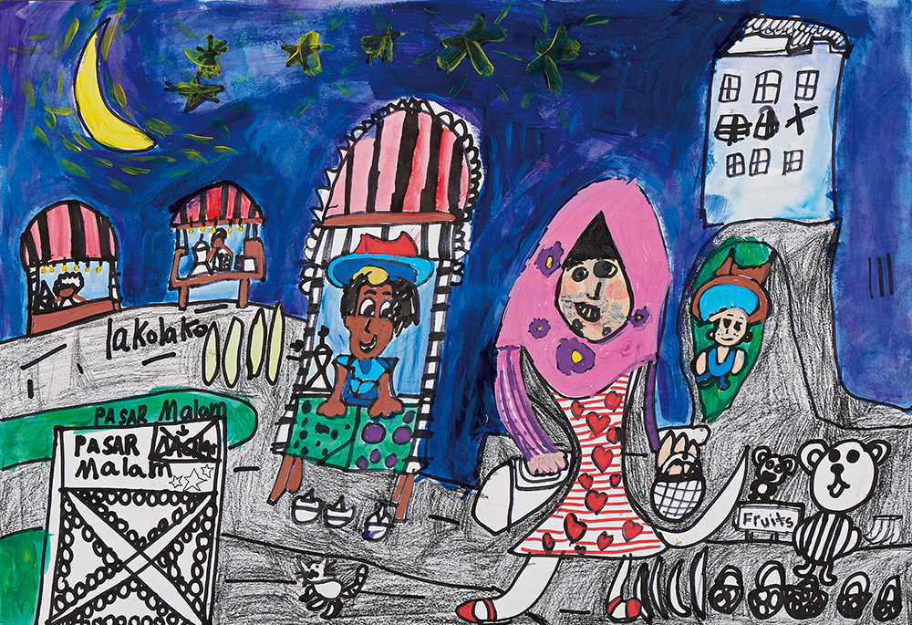 較稚拙的線描呈現夜市場景,孩子關注環境的特色,雖然沒有呈現人潮和活動, 但以星+I21光、月色表現夜市景象,是較特殊的方式。