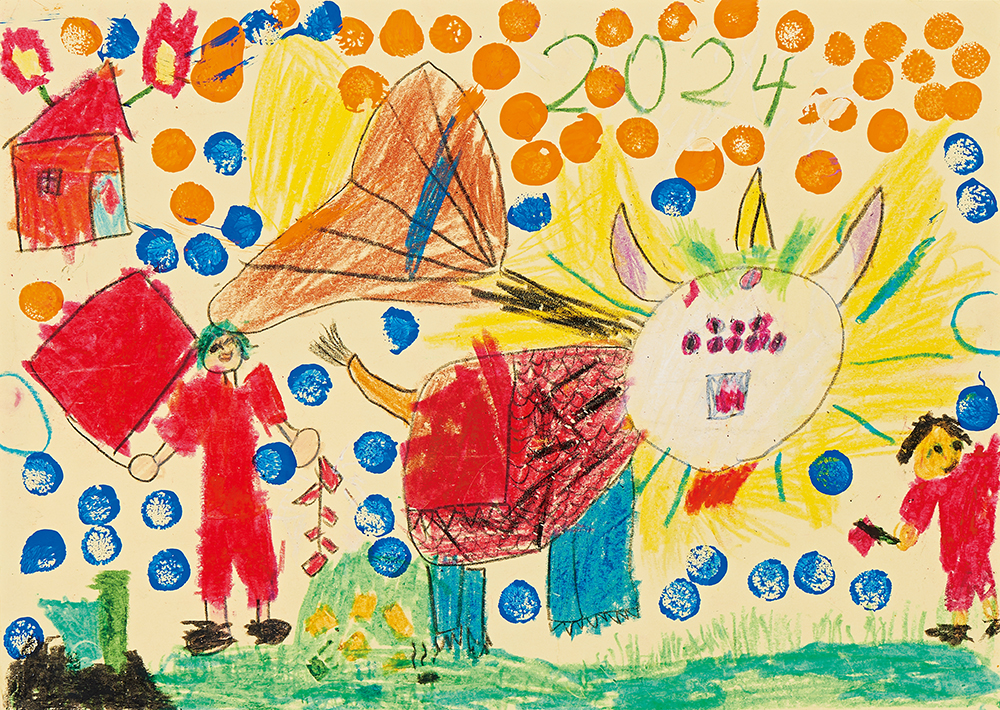 畫面中的年獸充滿孩子的想像力,手中的鞭炮意圖趕走年獸。是幅充滿歡樂氣氛與童趣的佳作。