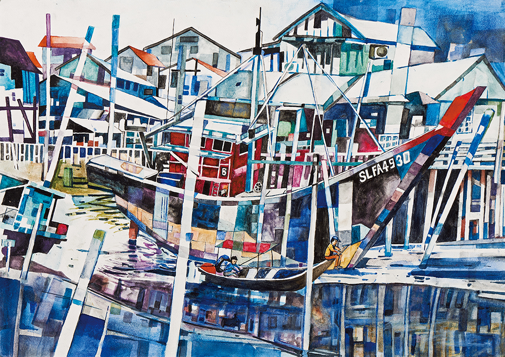 色彩顯明,大船小舟併立,充分顯現港灣風光。