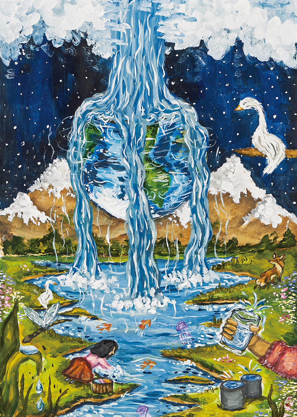 源源不絕的流水從地球不斷湧出,顯現作者對環境議題的重視。地球暖化已經影響人類,減碳工作刻不容緩。