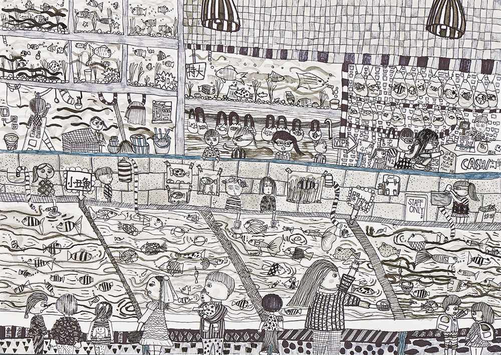 全幅用針筆細緻描繪魚店全貌,人物生動,各類魚兒悠遊自在,極為用心創作的好作品。明暗對比,十分清朗。