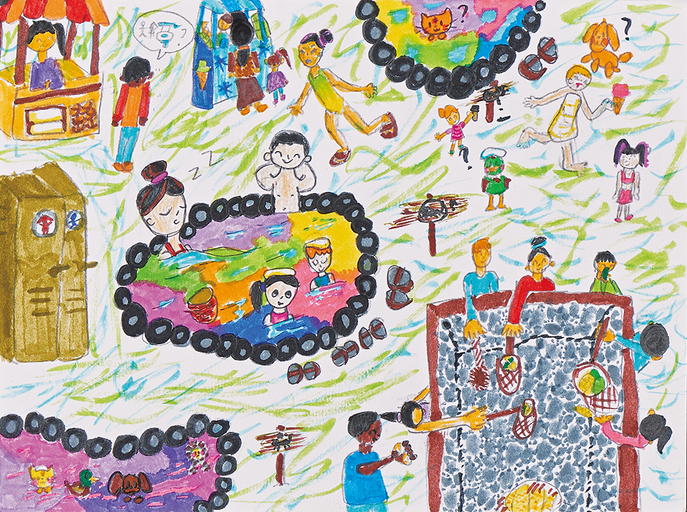 小孩生動活潑,游泳或撈魚動作非常可愛,整張畫作充滿生氣。