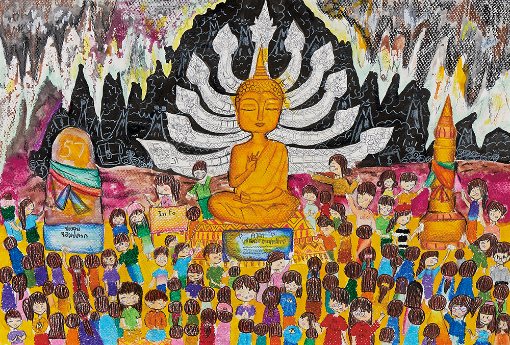 傳統信仰置中而莊嚴, 背景灰色調與前面人物多彩形成對比,人物多但豐富不雜亂,整體富變化。