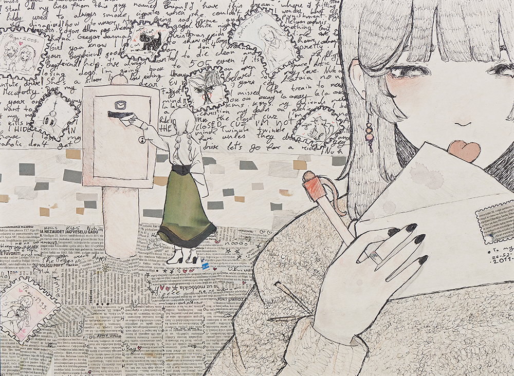 運用撕貼技巧,再佐以線畫效果,表現出等待好友信件的期待,同時在同一畫面表現出兩個空間,令人欣賞。