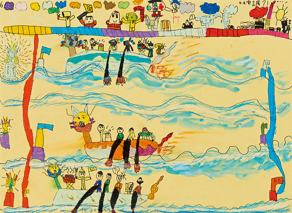 This painting depicts a dragon boat race, where one can enjoy the excitement and thrill of the competition
