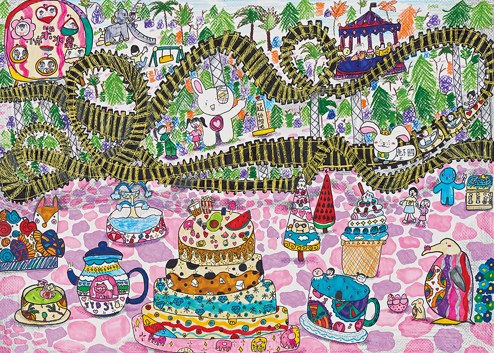 The scene is composed of desserts to create an amusement park setting, with a train circling around
