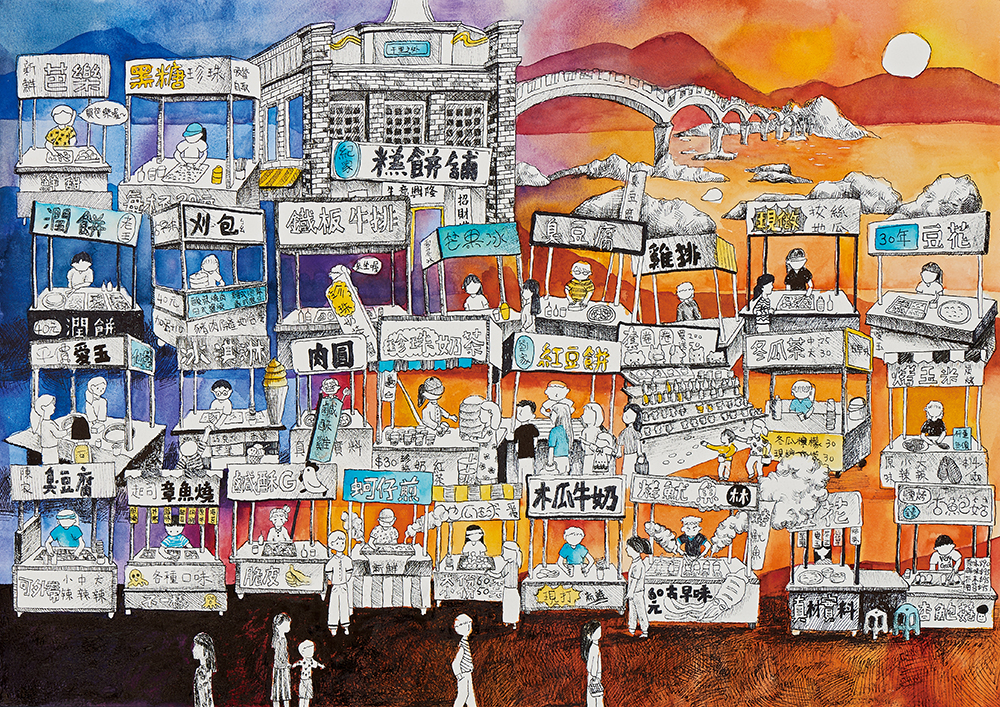 In this collage-like depiction of a bustling Taiwanese night market, the artist skillfully and intricately illustrates a variety of locally characteristic culinary cultures and life experiences. The handling of theme and background presents a harmonious yet contrasting beauty, conveying the most representative scenes of the artist's hometown and showcasing an interest and ambition for cultural exchange with different countries and regions.