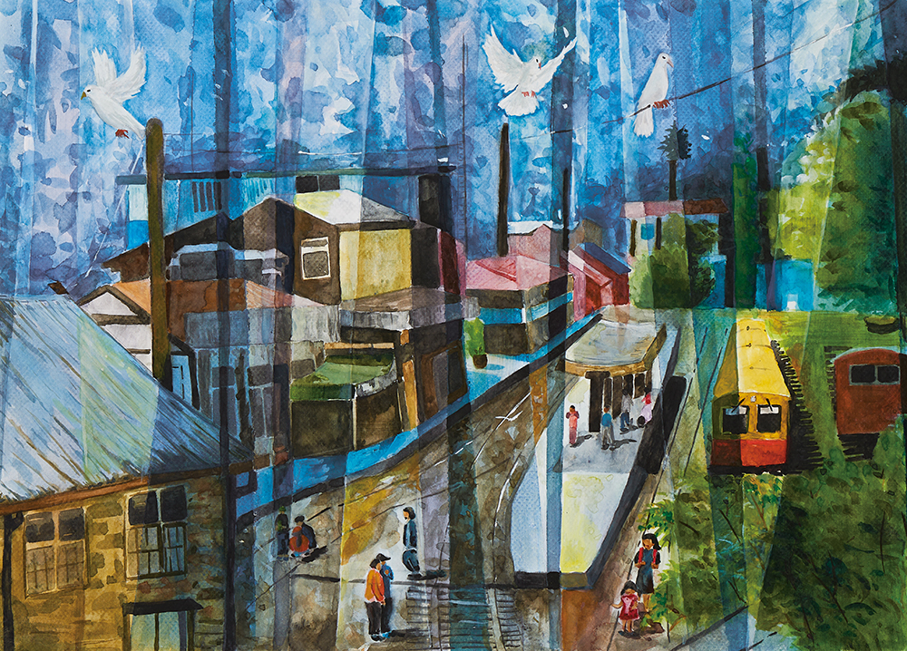It depicts a scene of a trainstation where the beginning and end of a journey intertwine, utilizing the characteristics of watercolor paint. |