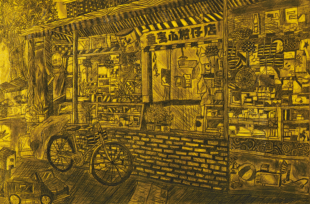 The linework in the print is intricately detailed, depicting depth, and the setup of the orange grocery