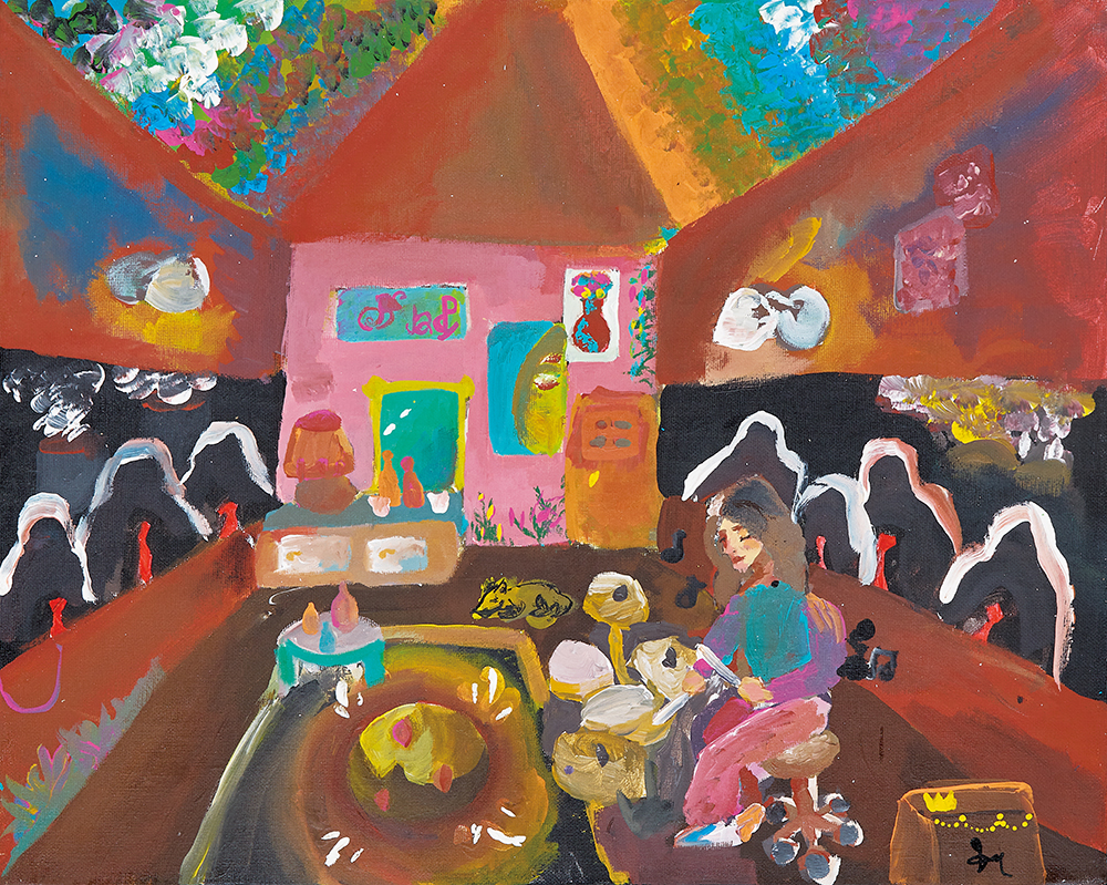 The theme of the painting subtly guides viewers' attention to the objects on the ground, which appear to be musicians playing instruments, showcasing the artist's unique emotions.
